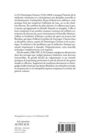 Le Dr Dominique Giniaux (1944-2004) a marqué l'histoire de la médecine vétérinaire en y introduisant une discipline nouvelle et révo lutionnaire, l'ostéopathie. Reçue d'abord avec méfiance, cette pratique finit par remporter l'adhésion de tous, au vu des résultats obtenus. Ses confrères les plus réticents s'y rallièrent peu à peu, à mesure qu'augmentait sa clientèle française et étrangère. Celle-ci était composée d'un nombre toujours croissant de célèbres entraîneurs de chevaux de course (notamment à Chantilly, Maisons-Laffitte et Grosbois), d'illustres cavaliers de sport ou écuyers (tel Bartabas, qui signe d'ailleurs la préface de l'ouvrage). Chacun dans sa discipline trouva, auprès de Dominique Giniaux et de sa pratique, la solution à des problèmes que la médecine classique paraissait impuissante à résoudre. Progressivement, cette nouvelle technique complémentaire s'est imposée. Dès les années 1986-1987, le Dr Giniaux consigna ses découvertes dans des ouvrages qui, malgré plusieurs rééditions, sont devenus in trouvables. Sa grande faculté de vulgarisation et ses conseils pratiques d'acupressing permettent à tous de découvrir des gestes simples et efficaces. Augmentés de nombreux documents et témoignages inédits réunis par son épouse Bénédicte, ses recherches et études en acupuncture et en ostéopathie équines composent la matière du présent volume.