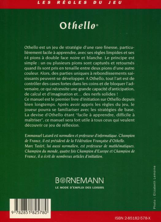 Othello est un jeu de stratégie d'une rare finesse, particulièrement facile à apprendre, avec ses règles limpides et ses 64 pions à double face noire et blanche. Le principe est simple : un ou plusieurs pions sont capturés et retournés quand ils sont pris en tenaille entre deux pions d'une autre couleur. Alors, des parties uniques à rebondissements saisissants peuvent se développer. A Othello, tout l'art est de contrôler des cases fortes dans les coins et de bloquer l'adversaire, ce qui nécessite une grande capacité d'anticipation, de calcul et d'imagination et...Des nerfs solides ! Ce manuel est le premier livre d'initiation sur Othello depuis bien longtemps. Après avoir appris les règles du jeu, le joueur pourra se familiariser avec les stratégies de base. La devise d'Othello étant " facile à apprendre, difficile à maîtriser ", ce manuel sera fort utile à tous ceux qui veulent découvrir ce jeu de réflexion.