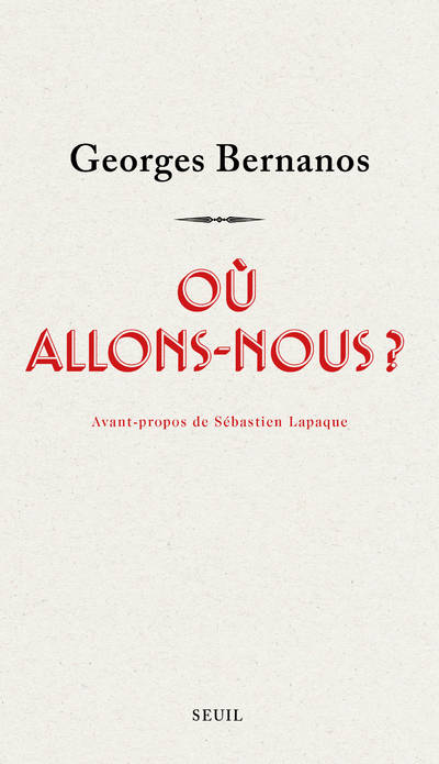 « Où allons-nous ? » demande Georges Bernanos. Depuis le Brésil, où il s’est exilé en 1938, le romancier a observé avec angoisse le saccage nazi de toutes les valeurs. Il a pressenti que celui-ci risquait de produire son souffle destructeur au sein des sociétés européennes longtemps après la victoire alliée. Qu’il s’agisse de la trahison des classes dirigeantes « emportées par leur mépris et la haine du peuple », du machinisme, de l’État total, de l’empire de l’argent, de la dictature anonyme ou de « l’immense appareil législatif et administratif » qui s’est mis en place pendant la guerre, l’écrivain aux dons de prophète a vu que l’humanité ne retrouverait pas ce qu’elle avait perdu — ou qu’elle le retrouverait sous une forme méconnaissable. Un texte saisissant.