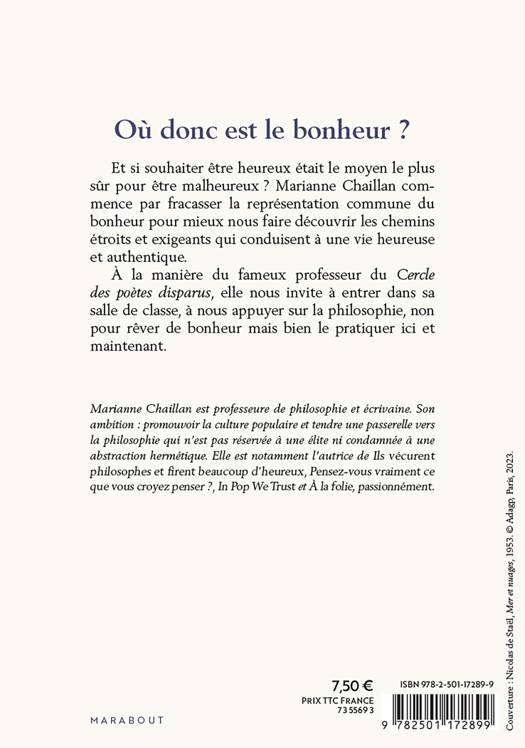 Et si souhaiter être heureux était le moyen le plus sûr d'être malheureux ? Marianne Chaillan commence par fracasser la représentation commune du bonheur pour mieux nous faire découvrir les chemins étroits et exigeants qui conduisent à une vie heureuse et authentique. À la manière du fameux professeur du Cercle des poètes disparus, elle nous invite à entrer dans sa salle de classe, à nous appuyer sur la philosophie, non pour rêver de bonheur mais bien le pratiquer ici et maintenant.