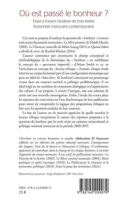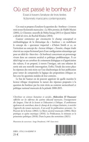 Cet essai se propose d'analyser la question du « bonheur » à travers trois textes fictionnels marocains : La Mère promise, de Habib Mazini (2001), Le Chanteur, nouvelle de Moha Souag (2011) et Quand Adam a décidé de vivre, de Rachid Khaless (2014). L'auteur commence par circonscrire le champ conceptuel et méthodologique de la thématique du « bonheur » en mobilisant le concept du « spectateur impartial » d'Adam Smith et ce, en l'articulant au concept du « lecteur éthique ». Ensuite, chaque étude réservée au corpus ctionnel part d'une conguration sémantique qui pose un idéal de « bien-être » (le bonheur) concernant un personnage vivant dans un contexte sociétal et politique problématique. À cet idéal érigé en un carrefour de croisement dialogique et d'appréciation des valeurs, il est proposé, à travers l'intrigue, soit une solution de sortie soit une nouvelle interrogation. Enn, l'étude des textes place les réponses des trois récits sur l'axe diachronique de leur publication pour tenter de comprendre la logique des propositions éthiques en lien avec les questions nodales de leur contexte. Le but de l'auteur est de pouvoir apprécier de quelle manière le lecteur éthique réceptionne la nature des réponses proposées à la question du bonheur par les trois récits au contexte socioculturel et politique national marocain de la période 2000-2015.