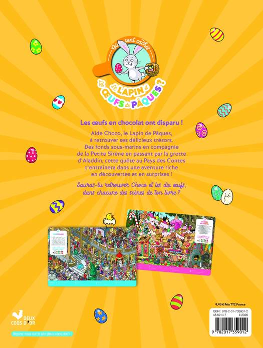 Les œufs en chocolat ont disparu ! Aide Choco, le Lapin de Pâques, à retrouver ses délicieux trésors. Des fonds sous-marins en compagnie de la Petite Sirène en passant par la grotte d'Aladdin, cette quête au Pays des Contes t'entraînera dans une aventure riche en découvertes et en surprises ! Sauras-tu retrouver Choco et les dix œufs, dans chacune des scènes de ton livre ?
