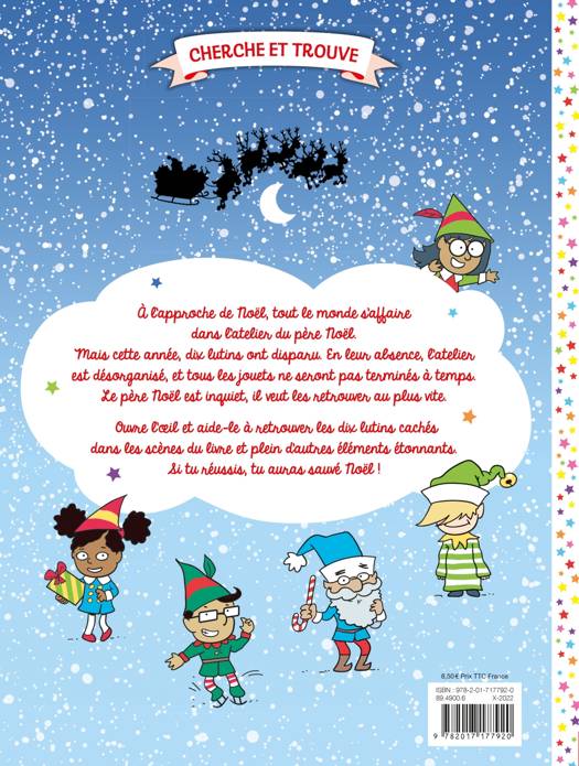 À l'approche de Noël, tout le monde s'affaire dans l'atelier du père Noël. Mais cette année, des lutins ont disparu. En leur absence, l'atelier est désorganisé, et tous les jouets ne seront pas terminés à temps. Le père Noël est inquiet, il veut les retrouver au plus vite. Ouvre l'œil et aide-le à retrouver les dix lutins cachés dans les scènes du livre et plein d'autres éléments étonnants. Si tu réussis, tu auras sauvé Noël !