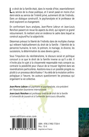 Le livre est construit comme un dialogue entre les auteurs à propos de l’évolution de la société d’une part et celle du droit d’autre part. La rencontre et la confrontation de leurs disciplines respectives mettent en évidence le cadre dans lequel se construit aujourd’hui la subjectivité. Sans bien sûr valoir d’emblée pour tout le monde, il n’en constitue pas moins la nouvelle donne dans laquelle émerge aujourd’hui le sujet. Celui-ci est-il encore invité à la citoyenneté responsable ou se contente-t-il d’être un consommateur susceptible de vivre addicté et victime ? Au-delà de la mutation anthropologique à l’œuvre, l’ensemble des processus qui organisent la vie collective sont questionnés.