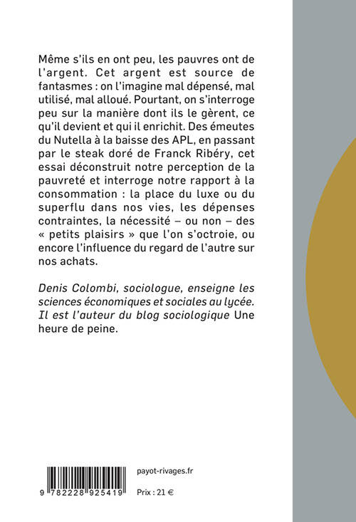 Même s'ils en ont peu, les pauvres ont de l'argent. Cet argent est source de fantasmes : on l'imagine mal dépensé, mal utilisé, mal alloué. Pourtant, on s'interroge peu sur la manière dont ils le gèrent, ce qu'il devient et qui il enrichit. Des émeutes du Nutella à la baisse des APL, en passant par le steak doré de Franck Ribéry, cet essai déconstruit notre perception de la pauvreté et interroge notre rapport à la consommation : la place du luxe ou du superflu dans nos vies, les dépenses contraintes, la nécessité - ou non - des « petits plaisirs » que l'on s'octroie, ou encore l'influence du regard de l'autre sur nos achats.
