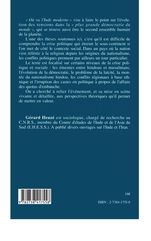 << Où ,,a l'Inde moderne » vise ù faire le point sur l'évolution <les tensions dans la « JJ/us irande démocratie du monde », qui se trouve aussi être le second ensemble humain de la planète. L'une des thèses soutenues ici, c'est qu'il est difficile de comprendre la crise politique qui étreint le sous-continent si l'on met de côté le contexte social. Dans un pays où la nation s'est référée ù la religion depuis les origines du nationalisme, les conflits politiques prennent par ailleurs un tour particulier. Le texte est focalisé sur certains niveaux de la crise politique et sociale : les émeutes entre hindous et musulmans, l'évolution de la démocratie, le problème de la laïcité, la montée du nationalisme hindou, les conflits régionaux ù base ethnique et l'irruption des castes en politique à propos de l'affaire des quotas <l'embauche. On a cherché à relier l'événement, et sa mise en scène vivante et détaillée, aux perspectives théoriques qu'il permet de mettre en valeur.