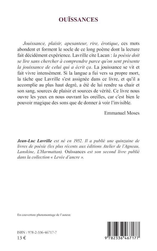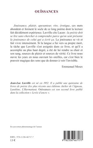 Jouissance, plaisir, apesanteur, rire, érotique, ces mots abondent et forment le socle de ce long poème dont la lecture fait décidément expérience. Lavrille cite Lacan : la poésie doit se lire sans chercher à comprendre parce qu’on sent présente la jouissance de celui qui a écrit ça. La jouissance se vit et fait vivre intensément. Si la langue a fui vers sa propre mort, la tâche que Lavrille s’est assignée dans ce livre, et qu’il a accomplie au plus haut degré, a été de lui rendre sa chair et son sang, sources de plaisir et sources de vérité. Ce livre nous ouvre les yeux en nous ouvrant les oreilles, car c’est bien le pouvoir magique des sons que de donner à voir l’invisible. Emmanuel Moses
