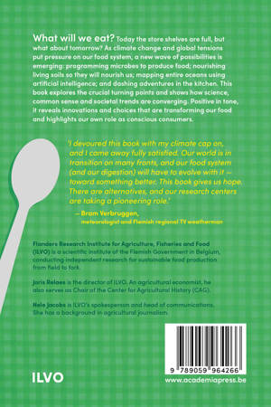 From microbes that produce our food to the soil that sustains us, from artificial intelligence scanning our seas to new culinary adventures in the kitchen. What will we eat? Today, store shelves are well stocked, but what about the future? As climate change and global tensions put pressure on our food system, science and agriculture are also evolving. This book takes you through some of the crucial turning points facing agriculture, fisheries, and food today -- from microbes that produce our food to the soil that sustains us, from artificial intelligence scanning our seas to new culinary adventures in the kitchen. Joris Relaes and Nele Jacobs focus on societal trends and technological innovations that are transforming our food. They tell a hopeful story about scientific progress, common sense, and the impact we can have as conscious consumers.