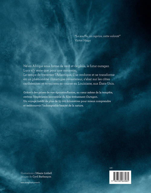 «OURAGAN, L'ODYSSÉE D'UN VENT» - LE LIVRE DU FIM De Jacqueline Farmer, Jean-Marc Hovasse et Emmanuelle Martin, illustré par Alexis Liddell Un texte étonnamment moderne de Victor Hugo, des images époustouflantes : «Ouragan» est un film en 3D qui fait vivre au spectateur, de l'intérieur, en immersion, un événement météorologique destructeur, auquel les humains n'ont d'autre choix que de se soumettre. Ce livre en restitue les prises de vue spectaculaires, tout en donnant les clés, grâce à des encarts scientifiques illustrés, pour comprendre ces phénomènes naturels : qu'est-ce qu'une mousson, comment se forme un ouragan, pourquoi lui donner un nom...