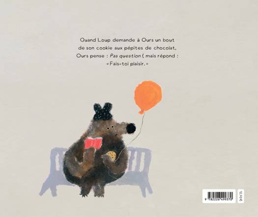 Ours aime son cookie, son livre et son ballon. Et surtout, il aime être tranquille, assis sur son banc. Mais lorsque Renard, puis Loup, puis Lapin lui demandent de partager, Ours ne sait pas dire non. Alors il accepte, à contrecoeur, jusqu'à... GROOOAAAHH ! exploser. Même si lui aussi, dans le fond, aime bien quand les autres partagent !
