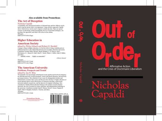 The policy of affirmative action, today, more so than in the Civil Rights era, is under severe scrutiny. Nicholas Capaldi's Out of Order typifies the present-day criticism of affirmative action and shows how we have shifted from equality of opportunity and individual merit to the concept of group entitlement and statistical quality of result. Capaldi contends that affirmative action has not solved the problem of equal opportunity for which it was presumably designed, it has instead created a new moral dilemma in the form of reverse discrimination. Out of Order highlights key affirmative action issues from the time of the Civil Rights Act of 1964 through the Bakke decision, the Weber case of 1979, and beyond. Capaldi illuminates not only the historical/judicial complexion of affirmative action policies but also their philosophical and social implications. Capaldi questions the necessity of affirmative action, whether its creation was based upon a valid definition of the nature and extent of discrimination, and whether it is a suitable policy for dealing with discrimination. Capaldi maintains that the creation of affirmative action evolved more out of social theory than social reality. By carefully documenting the legislative and judicial history of the Civil Rights Act, the author argues that affirmative action is a bureaucratic fabrication, that it is not a solution to a problem but a policy in search of problems. The crux of Capaldi's thesis boldly claims that affirmative action is perpetuated by the self-interest of "modern liberals" who "guide and control the system from their superior vantage point." Moreover, affirmative action is centered on education and has its roots in doctrinaire liberalism. Since that social philosophy attaches a crucial role to education, and since the conflicting demands made upon the modern American university have exposed its inability to generate coherent policies, doctrinaire liberalism has undergone a crisis of confidence.