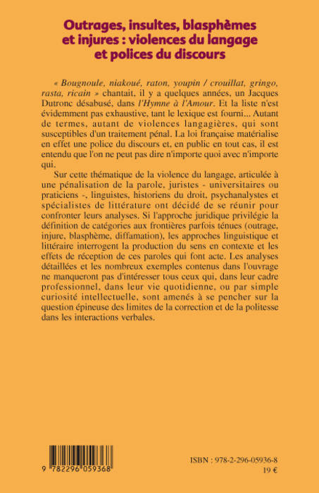 "Bougnoule, niakoué, raton, youpin/crouillat, gringo, rasta, ricain" chante un Jacques Dutronc désabusé, dans l'Hymne à l'Amour. Autant de termes, de violences langagières, susceptibles d'un traitement pénal. Juristes, linguistes, historiens du droit, psychanalystes et spécialistes de littérature confrontent ici leurs analyses. Si l'approche juridique privilégie la définition de catégories aux frontières parfois ténues (outrage, injure, blasphème, diffamation), les approches linguistique et littéraire interrogent la production du sens en contexte et les effets de réception de ces paroles qui font acte.