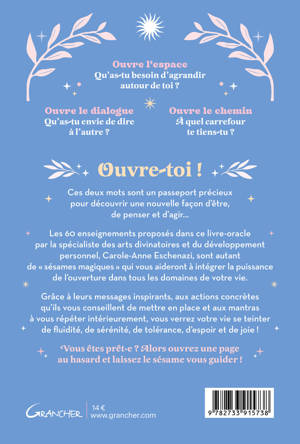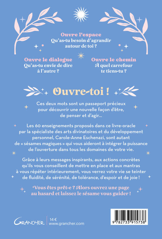 Ouvre-toi ! Ces deux mots sont un passeport précieux pour découvrir une nouvelle façon d’être, de penser et d’agir… Les 60 enseignements proposés dans ce livre-oracle par la spécialiste des arts divinatoires et du développement personnel, Carole-Anne Eschenazi, sont autant de « sésames magiques » qui vous aideront à intégrer la puissance de l’ouverture dans tous les domaines de votre vie. Grâce à leurs messages inspirants, aux actions concrètes qu’ils vous conseillent de mettre en place et aux mantras à vous répéter intérieurement, vous verrez votre vie se teinter de fluidité, de sérénité, de tolérance, d’espoir et de joie ! Vous êtes prêt·e ? Alors ouvrez une page au hasard et laissez le sésame vous guider !