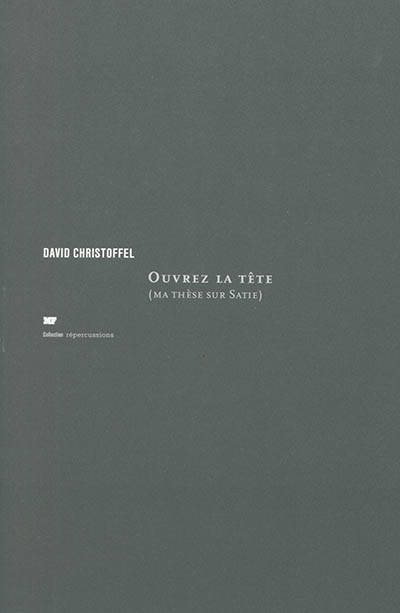 Musicologue, poète et compositeur, c'est à tous ces titres que David Christoffel s'intéresse à Erik Satie (1866-1925), auteur des célèbres Gymnopédies et inventeur de la musique d'ameublement. Son livre se penche sur les étonnantes mentions verbales qui figurent dans les partitions du compositeur ' dont par exemple « Ne souffle pas dans tes oreilles », « Enfouissez le son », « En se regardant de loin », « Encore plus barbant si possible », etc. David Christoffel ne se contente pas de les resituer dans leur contexte historique, il montre aussi qu'elles ouvrent un espace poétique original au carrefour de la musique, de la poésie et de la performance. Le livre sortira en 2016, à l'occasion du 150e anniversaire de la naissance d'Erik Satie.