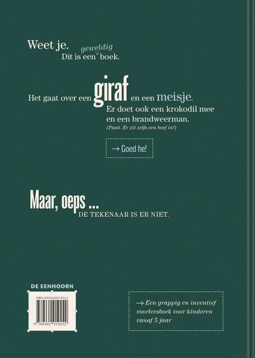 Gelukkig zorgt de vormgever voor een alternatief vol inventiviteit en verbeelding. Dit is een geweldig boek. Het gaat over een giraf, Bert, die een hondje wil zijn. Op een dag ontmoet hij een meisje. Hij weet het meteen: zij mag zijn baasje zijn. Het is het begin van een knotsgek avontuur met alle klassieke ingrediënten van een prentenboek: een agent, een dief, een krokodil in een boom, de brandweer en een ijscokar. Alleen: de tekenaar is op reis … Juist dat blijkt dit verhaal nog beter te maken.