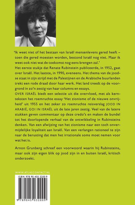 Over Israël biedt een selectie uit die overvloed, met als kern het roemruchte essay 'Het zionisme of de nieuwe onvrijheid' uit 1955 en het zeker zo roemruchte reisverslag 'Jood in Arabië', Goi in Israël' uit de late jaren zestig. Veel van haar latere stukken geven commentaar op deze credo's en maken dit boek tot het doorlopende verhaal van de ontwikkeling in Rubinsteins denken. Van een afwijzing van het zionisme naar een toch onvermijdelijke loyaliteit aan Israël. Van een verlangen rationeel te zijn naar de berusting dat men het irrationale soms moet nemen voor wat het is