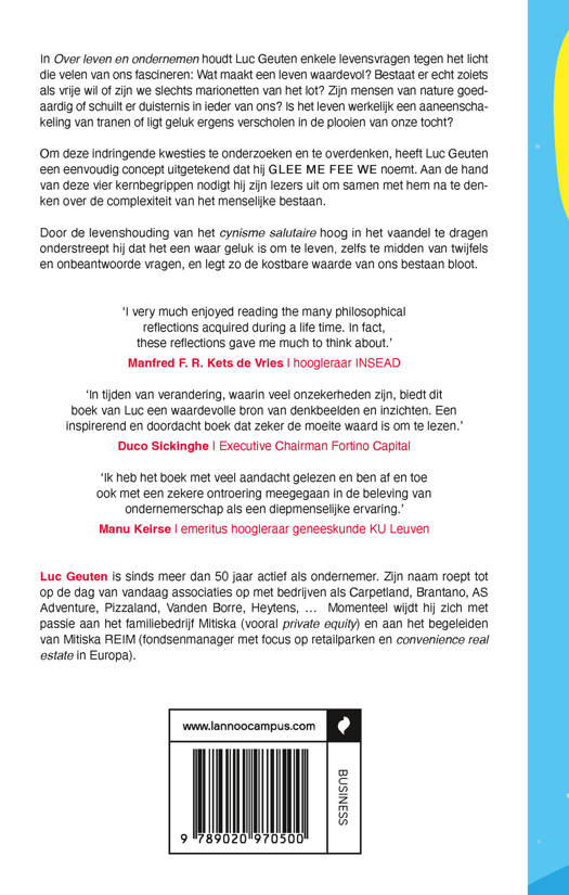 In Over leven en ondernemen houdt Luc Geuten enkele levensvragen tegen het licht die velen van ons fascineren: Wat maakt een leven waardevol? Bestaat er echt zoiets als vrije wil of zijn we slechts marionetten van het lot? Zijn mensen van nature goedaardig of schuilt er duisternis in ieder van ons? Is het leven werkelijk een aaneenschakeling van tranen of ligt geluk ergens verscholen in de plooien van onze tocht?