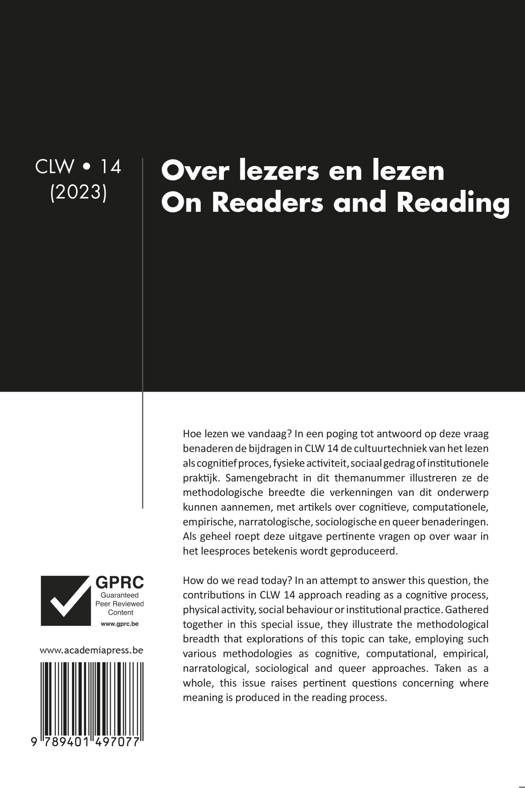 NL - Hoe lezen we vandaag? In een poging tot antwoord op deze vraag benaderen de bijdragen in CLW 14 de cultuurtechniek van het lezen als cognitief proces, fysieke activiteit, sociaal gedrag of institutionele praktijk. Samengebracht in dit themanummer illustreren ze de methodologische breedte die verkenningen van dit onderwerp kunnen aannemen, met artikels over cognitieve, computationele, empirische, narratologische, sociologische en queer benaderingen.