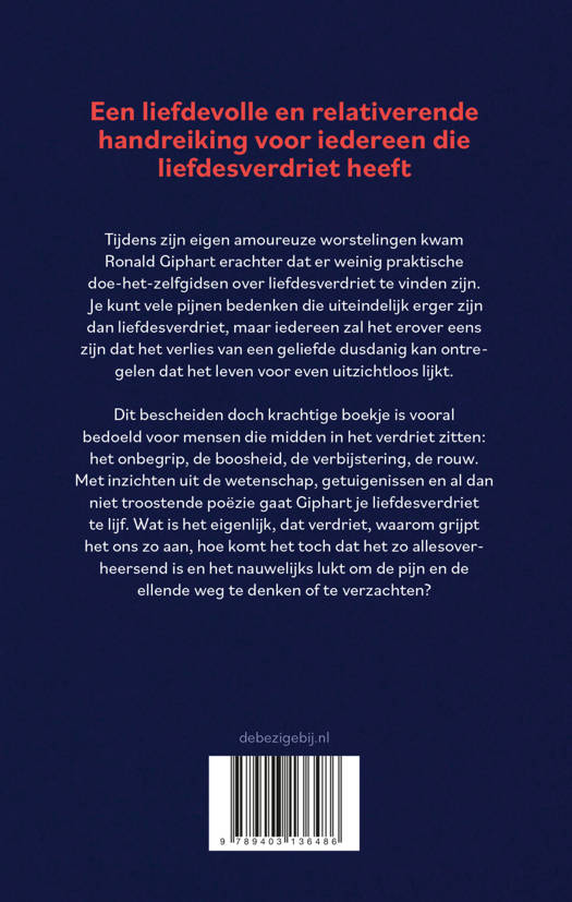 Tijdens zijn eigen amoureuze worstelingen kwam Ronald Gipharts erachter dat er weinig praktische doe-het-zelfgidsen over liefdesverdriet te vinden zijn. Je kunt vele pijnen bedenken die uiteindelijk erger zijn dan liefdesverdriet, maar iedereen zal het erover eens zijn dat het verlies van een geliefde dusdanig kan ontregelen dat het leven voor even uitzichtloos lijkt.