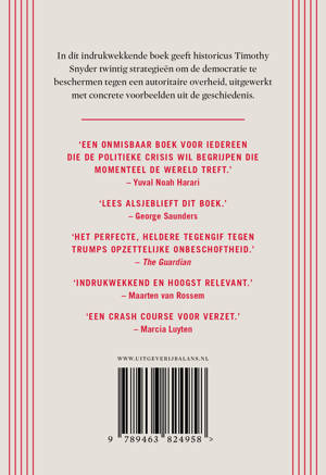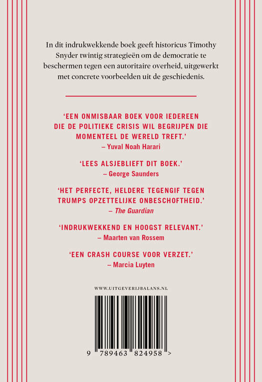 Hoe kunnen wij als individu het begin van een totalitair regime herkennen? Hoe kunnen we ons daartegen verzetten? In het indrukwekkende Over tirannie geeft historicus Timothy Snyder ons twintig strategieën om de democratie te beschermen tegen een autoritaire overheid, uitgewerkt met concrete voorbeelden uit de geschiedenis.