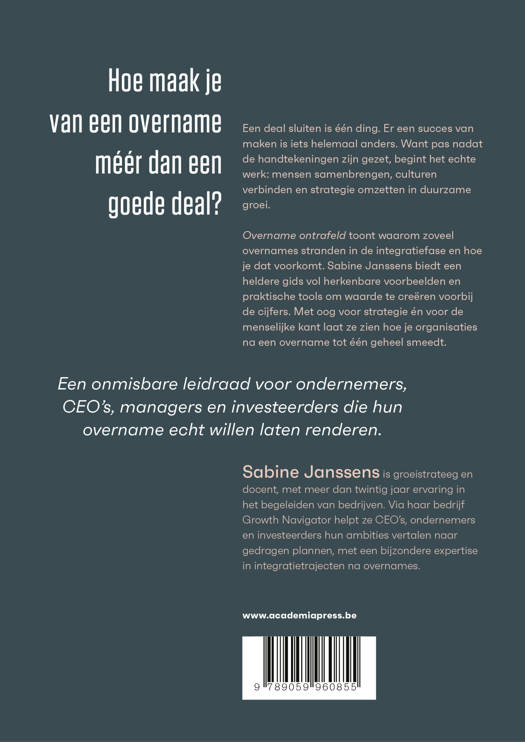 Een deal sluiten is één ding. Er een succes van maken is iets helemaal anders. Want pas nadat de handtekeningen zijn gezet, begint het echte werk: mensen samenbrengen, culturen verbinden en strategie omzetten in duurzame groei. Overname ontrafeld toont waarom zoveel overnames stranden in de integratiefase en hoe je dat voorkomt. Sabine Janssens biedt een heldere gids vol herkenbare voorbeelden en praktische tools om waarde te creëren voorbij de cijfers. Met oog voor strategie én voor de menselijke kant laat ze zien hoe je organisaties na een overname tot één geheel smeedt. Een onmisbare leidraad voor ondernemers, CEO's, managers en investeerders die hun overname echt willen laten renderen.