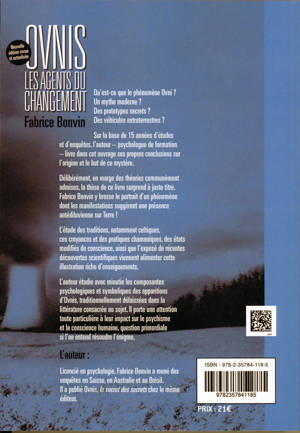 Qu'est-ce que le phénomène Ovni ? Un mythe moderne ? Des prototypes secrets ? Des véhicules extraterrestres ? Sur la base de 15 années d'études et d'enquêtes, l'auteur - psychologue de formation - livre dans cet ouvrage ses propres conclusions sur l'origine et le but de ce mystère. Délibérément, en marge des théories communément admises, la thèse de ce livre surprend à juste titre. Fabrice Bonvin y brosse le portrait d'un phénomène dont les manifestations suggèrent une présence antédiluvienne sur Terre ! L'étude des traditions, notamment celtiques, ces croyances et des pratiques chamaniques, des états modifiés de conscience, ainsi que l'exposé de récentes découvertes scientifiques viennent alimenter cette illustration riche d'enseignements. L'auteur étudie avec minutie les composantes psychologiques et symboliques des apparitions d'Ovnis, traditionnellement délaissées dans la littérature consacrée au sujet. Il porte une attention toute particulière à leur impact sur le psychisme et la conscience humaine, question primordiale si l'on entend résoudre l'énigme. Licencié en psychologie, Fabrice Bonvin a mené des enquêtes en Suisse, en Australie et au Brésil. Il vit à Genève.