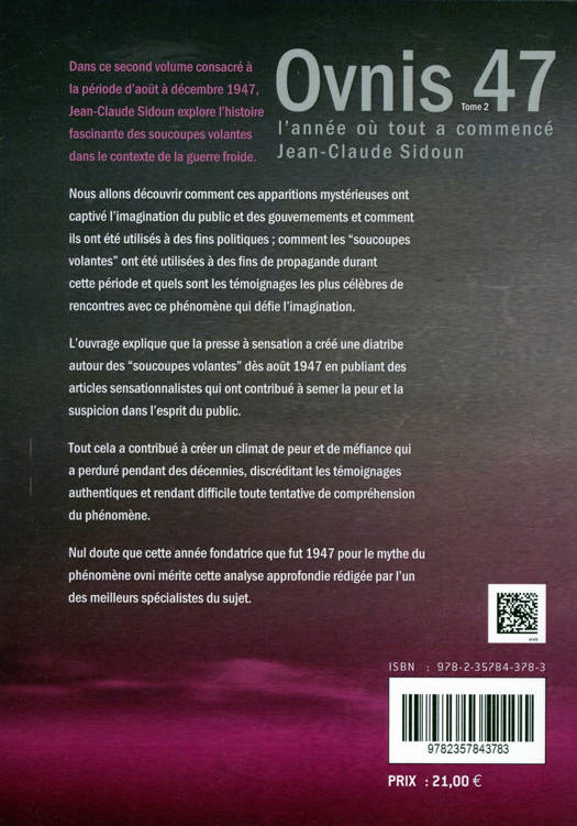 Dans ce second volume consacré à la période d’août à décembre 1947, Jean-Claude Sidoun explore l'histoire fascinante des soucoupes volantes dans le contexte de la guerre froide. Nous allons découvrir comment ces apparitions mystérieuses ont captivé l'imagination du public et des gouvernements et comment ils ont été utilisés à des fins politiques ; comment les soucoupes volantes ont été utilisées à des fins de propagande pendant la guerre froide et quels sont les témoignages les plus célèbres de rencontres avec ce phénomène qui défie l’imagination. L’ouvrage explique que la presse à sensation a créé une diatribe autour des soucoupes volantes dès août 1947 en publiant des articles sensationnalistes qui ont contribué à semer la peur et la suspicion dans l'esprit du public. Tout cela a contribué à créer un climat de peur et de méfiance autour des ovnis qui a perduré pendant des décennies, discréditant les témoignages authentiques et rendant difficile toute tentative de compréhension du phénomène. Nul doute que cette année fondatrice que fut 1947 pour le mythe du phénomène ovni mérite cette analyse approfondie rédigée par l’un des meilleurs spécialistes du sujet.