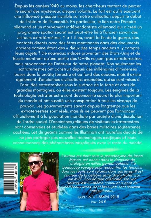 Ouvrage de divulgation. Condensé des OVNIS dans l'histoire, leur provenance, leur lien avec notre civilisation. Reposant sur des documents d'époque et des témoignages, illustré de nombreuses images en noir et blanc. Couvre de nombreux sujets connexes. Depuis les années 1940 au moins, les chercheurs tentent de percer le secret des mystérieux disques volants. Le fait est qu'ils exercent une influence presque invisible sur notre civilisation depuis le début de l'histoire de l'humanité. En particulier, le lien entre l'Empire allemand et un mouvement indépendantiste allemand qui a créé un programme spatial secret est peut-être lié à l'ancien savoir des visiteurs extraterrestres. Y a-t-il eu, avant la fin de la guerre, des contacts directs avec des êtres mentionnés dans des documents anciens comme étant des « dieux des temps anciens », y compris leurs objets ? De nouveaux indices provenant des États-Unis et de Russie montrent qu'une partie des OVNIs ne sont pas extraterrestres, mais proviennent de l'intérieur de notre planète. Non seulement les extraterrestres ont construit depuis des millénaires d'immenses bases dans la croûte terrestre et au fond des océans, mais il existe également d'anciennes civilisations avancées, qui se sont mises à l'abri des catastrophes sous la surface de la terre et dans de grandes montagnes, où elles existent toujours. Les énigmes de la technologie extraterrestre sont devenues le secret le plus important du monde et ont suscité une conspiration à tous les niveaux de pouvoir. Les gouvernements savent depuis longtemps que les extraterrestres sont réels, mais ils ne peuvent pas l'annoncer officiellement à la population mondiale par crainte d'une dissolution de l'ordre social. D'anciennes reliques de visiteurs extraterrestres sont conservées et étudiées dans des bases militaires souterraines cachées. Les dirigeants comme les Illuminati ont toutefois décidé de ne pas partager ces nouvelles technologies exotiques et leurs connaissances des phénomènes inexpliqués avec le reste du monde.