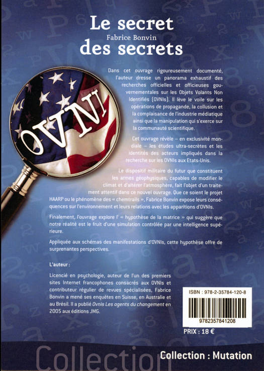 Dans cet ouvrage rigoureusement documenté, l'auteur dresse un panorama exhaustif des recherches officielles et officieuses gouvernementales sur les ovnis. Il lève le voile sur les opérations de propagande, la collusion et la complaisance de l'industrie médiatique ainsi que la manipulation qui s'exerce sur la communauté scientifique. Cet ouvrage révèle – en exclusivité mondiale – les études ultrasecrètes et les identités des acteurs impliqués dans la recherche sur les OVNIs aux Etats-Unis. Le dispositif militaire du futur que constituent les armes géophysiques, capables de modifier le climat et d'altérer l'atmosphère, fait l'objet d'un traitement attentif dans ce nouvel ouvrage. Que ce soient le projet HAARP ou le phénomène des chemtrails, Fabrice Bonvin expose leurs conséquences sur l'environnement et leurs relations avec les apparitions d'OVNIs. Finalement, l'ouvrage explore l'hypothèse de la matrice qui suggère que notre réalité est le fruit d'une simulation contrôlée par une intelligence supérieure. Appliquée aux schémas des manifestations d'OVNIs, cette hypothèse offre de surprenantes perspectives. Licencié en psychologie, auteur de l'un des premiers sites Internet francophones consacrés aux OVNIs et contributeur régulier de revues spécialisées, Fabrice Bonvin a mené ses enquêtes en Suisse, en Australie et au Brésil. Il a publié « Ovnis Les agents du changement » en 2005 aux éditions JMG.