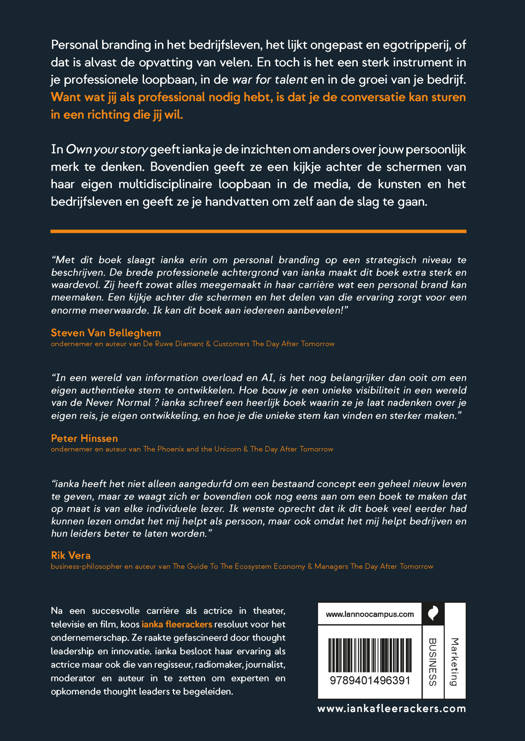 In Own your story geeft ianka je de inzichten om anders over jouw persoonlijk merk te denken. Bovendien geeft ze een kijkje achter de schermen van haar eigen multidisciplinaire loopbaan in de media, de kunsten en het bedrijfsleven en geeft ze je handvatten om zelf aan de slag te gaan.