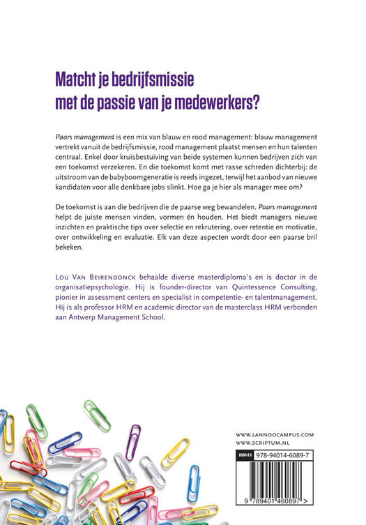 Paars management is een mix van blauw en rood management: blauw management vertrekt vanuit de bedrijfsmissie, rood management plaatst mensen en hun talenten centraal. Enkel door kruisbestuiving van beide systemen kunnen bedrijven zich van een toekomst verzekeren. En die toekomst komt met rasse schreden dichterbij: de uitstroom van de babyboomgeneratie is reeds ingezet, terwijl het aanbod van nieuwe kandidaten voor alle denkbare jobs slinkt. Hoe ga je hier als manager mee om?
