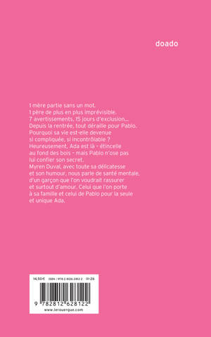 Depuis la rentrée, Pablo a eu sept avertissements. Sa mère est partie sans expliquer pourquoi. Son père a des comportements de moins en moins rationnels. Et son amie Ada... son amie Ada, il aimerait que ce soit plus qu'une amie. Mais impossible de se confier à elle. Depuis quand la vie de Pablo est devenue aussi compliquée ? Aussi dense ? Comme un bois dans lequel on se perdrait. Et si tout était lié ? Si dans ce bois, il n'était pas seul ? Si son père avait toutes les réponses ? Myren Duval, avec des dialogues bourrés d'humour et une délicatesse rare, nous parle de santé mentale, d'un garçon que l'on voudrait rassurer et surtout d'amour. Celui que l'on porte à sa famille et celui de Pablo pour la seule et unique Ada.
