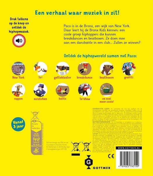 Met één druk op de knop klinkt op elke pagina een hiphopfragment vol ritme en beatbox, waardoor kinderen niet alleen kijken, maar ook écht luisteren. Zo maken ze spelenderwijs kennis met rap, dj-geluiden en typische hiphopbeats. De combinatie van muziek en illustratie nodigt uit om mee te bewegen en zelf ritmes te maken.