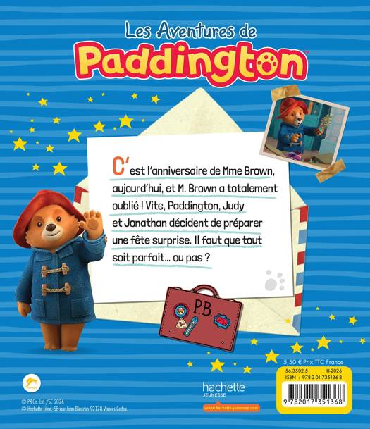 Dès 3 ans.Résumé :C’est l’anniversaire de Mme Brown, aujourd’hui, et M. Brown a totalement oublié ! Vite, Paddington, Judy et Jonathan décident de préparer une fête surprise. Il faut que tout soit parfait… ou pas ?