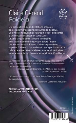 Dix petites filles dans dix stations en orbite autour de la Lune sont les derniers espoirs de l’humanité, morte sur une Terre empoisonnée. Parce que l’une d’elles rêve d’arpenter les planètes, qu’elle est le souffre-douleur des autres, elle relève un défi stupide et découvre ce qu’on leur cache  : leur destin de mères des futurs Terriens dans le village lunaire en construction. Seule contre l’univers, elle refuse cet avenir qu’on lui a assigné. Aussi enragée que touchante, elle ira jusqu’au bout.