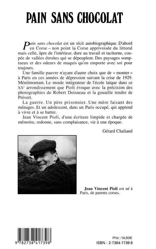 Pain sans chocolat est un récit autobiographique. D'abord  en Corse - non point la Corse apprivoisée du littoral mais celle, âpre de l'intérieur, dure au travail et taciturne, cou­pée de vallées étroites qui se dépeuplent. Des paysages somp­tueux et des odeurs de maquis qu'on emporte avec soi pour toujours.