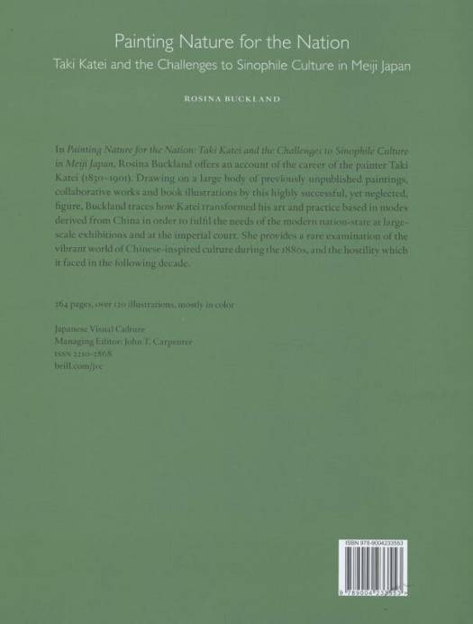 In Painting Nature for the Nation: Taki Katei and the Challenges to Sinophile Culture in Meiji Japan, Rosina Buckland offers an account of the career of the painter Taki Katei (1830-1901). Drawing on a large body of previously unpublished paintings, collaborative works and book illustrations by this highly successful, yet neglected, figure, Buckland traces how Katei transformed his art and practice based in modes derived from China in order to fulfil the needs of the modern nation-state at large-scale exhibitions and at the imperial court. She provides a rare examination of the vibrant world of Chinese-inspired culture during the 1880s, and the hostility which it faced in the following decade.