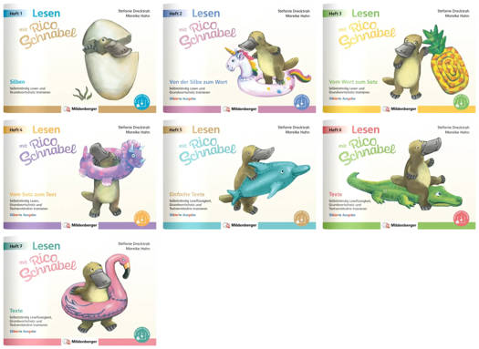 Die silbierten Lese- und Arbeitshefte mit dem liebenswerten Schnabeltier wecken die Lust am Lesen und ebnen für jedes Kind den Weg zu besseren Lesefertigkeiten, einem größeren Wortschatz, selbstständigem Arbeiten, besserer Leseflüssigkeit sowie zu einem besseren Textverständnis!Informationen zur Reihe Lesen mit Rico Schnabel:Die lehrwerksunabhängige Reihe Lesen mit Rico Schnabel erweitert die erfolgreichen Rico Schnabel-Titel im Bereich Rechtschreibung, Grammatik und Diktate um den Aspekt des Lesens. Die Lese- und Arbeitshefte richten sich an alle Lernenden der 1. Klasse und setzen an der grundlegendsten Basis an. Die Progressionsstufen gehen dabei fließend ineinander über. Sie erstrecken sich von der Silbenebene über die Wortebene hin zur Satzebene, anschließend zu einfachen bis schließlich zu komplexeren Texten und Aufgaben. Geeignet sind die Hefte auch für schwächere Kinder. Die handlichen Hefte mit dem liebenswerten Schnabeltier ermöglichen dementsprechend einen idealen Einstieg in das Training und die Vertiefung der grundlegendsten Lesefertigkeiten. Sukzessiv verbessern die Kinder dann im weiteren Verlauf der Hefte ihr Textverständnis und ihre Leseflüssigkeit. Durch weitgehend selbsterklärende Aufgabenformate, die Progression sowie das zugrundeliegende Anforderungsniveau, werden die Kinder an das selbstständige Arbeiten und Lernen herangeführt. Ebenso erweitern sie permanent ihren Wortschatz anhand von Wörtern der verbindlichen Grundwortschätze der Bundesländer. Verschiedene Aufgabenformate animieren die Kinder zum sinnentnehmenden Lesen, ohne dass sie dabei die Motivation oder die Lust am Lesen verlieren oder überfordert werden. So haben die Titel der Lesen mit Rico Schnabel-Reihe nicht zuletzt das Ziel, die Begeisterung für das Lesen selbst in den Kindern zu wecken.Die Lese- und Arbeitshefte der Lesen mit Rico Schnabel-Reihe lassen sich lehrwerksunabhängig oder parallel zum ABC der Tiere-Lehrgang einsetzen. Mit Ausnahme von Heft 1, sind alle Titel der Reihe sowohl als silbierte Ausgaben als auch als unsilbierte Ausgaben erhältlich.Die Nummerierung der Hefte spiegelt dabei nicht die Klassenstufen, sondern die empfohlene Abfolge ihres Einsatzes wider. So kann - passend zum jeweiligen Entwicklungsstand des Kindes - das entsprechende Heft gewählt und auf den jeweiligen Stand fortschreitend aufgebaut werden. Die Lösungen am Ende des Hefts ermöglichen eine Selbstkontrolle.Der Komplettbezug beinhaltet 7 Titel:Lesen mit Rico Schnabel, Heft 1: Silben / ISBN 978-3-619-12051-2Lesen mit Rico Schnabel, Heft 2: Von der Silbe zum Wort - Silbierte Ausgabe / ISBN 978-3-619-12062-8Lesen mit Rico Schnabel, Heft 3: Vom Wort zum Satz - Silbierte Ausgabe / ISBN 978-3-619-12063-5Lesen mit Rico Schnabel, Heft 4: Vom Satz zum Text - Silbierte Ausgabe / ISBN 978-3-619-12064-2Lesen mit Rico Schnabel, Heft 5: Einfache Texte - Silbierte Ausgabe / ISBN 978-3-619-12065-9Lesen mit Rico Schnabel, Heft 6: Texte - Silbierte Ausgabe / ISBN 978-3-619-12066-6Lesen mit Rico Schnabel, Heft 7: Texte - Silbierte Ausgabe / ISBN 978-3-619-12067-3