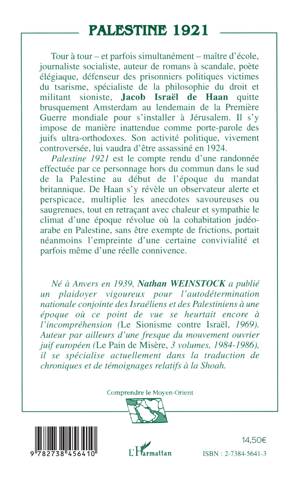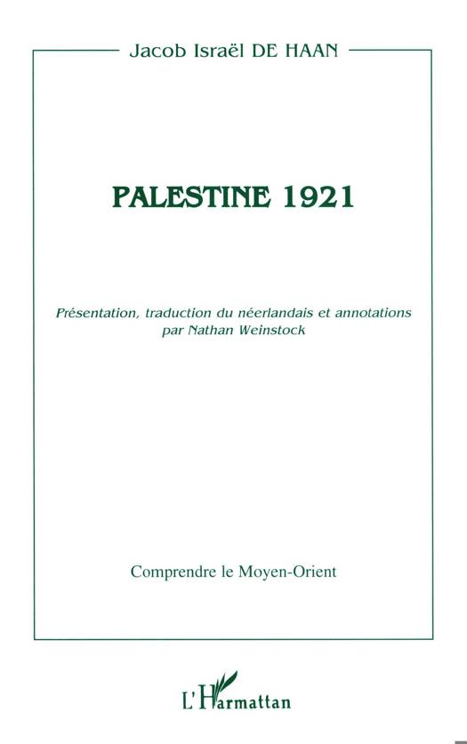 Tour à tour - et parfois simultanément - maître d'école, journaliste socialiste, auteur de romans à scandale, poète élégiaque, défenseur des prisonniers politiques victimes du tsarisme, spécialiste de la philosophie du droit et militant sioniste, Jacob Israël de Haan quitte brusquement Amsterdam au lendemain de la Première Guerre mondiale pour s'installer à Jérusalem. Il s'y impose de manière inattendue comme porte-parole des juifs ultra-orthodoxes. Son activité politique, vivement controversée, lui vaudra d'être assassiné en 1924. Palestine 1921 est le compte rendu d'une randonnée effectuée par ce personnage hors du commun dans le sud de la Palestine au début de l'époque du mandat britannique. De Haan s'y révèle un observateur alerte et perspicace, multiplie les anecdotes savoureuses ou saugrenues, tout en retraçant avec chaleur et sympathie le climat d'une époque révolue où la cohabitation judéoarabe en Palestine, sans être exempte de frictions, portait néanmoins l'empreinte d'une certaine convivialité et parfois même d'une réelle connivence.