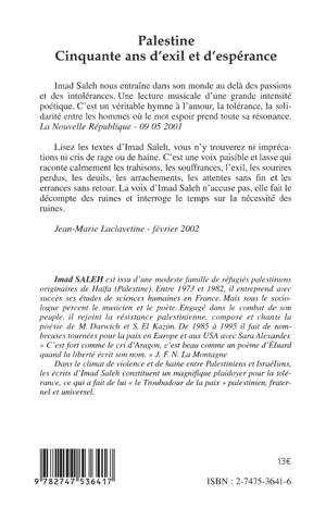 Imad Saleh nous entraîne dans son monde au delà des passions et des intolérances. Une lecture musicale d'une grande intensité poétique. C'est un véritable hymne à l'amour, la tolérance, la solidarité entre les hommes où le mot espoir prend toute sa résonance. La Nouvelle République - 09 05 2001 Lisez les textes d'Imad Saleh, vous n'y trouverez ni imprécations ni cris de rage ou de haine. C'est une voix paisible et lasse qui raconte calmement les trahisons, les souffrances, l'exil, les sourires perdus, les deuils, les arrachements, les attentes sans fin et les errances sans retour. La voix d'lmad Saleh n'accuse pas, elle fait le décompte des ruines et interroge le temps sur la nécessité des ruines.