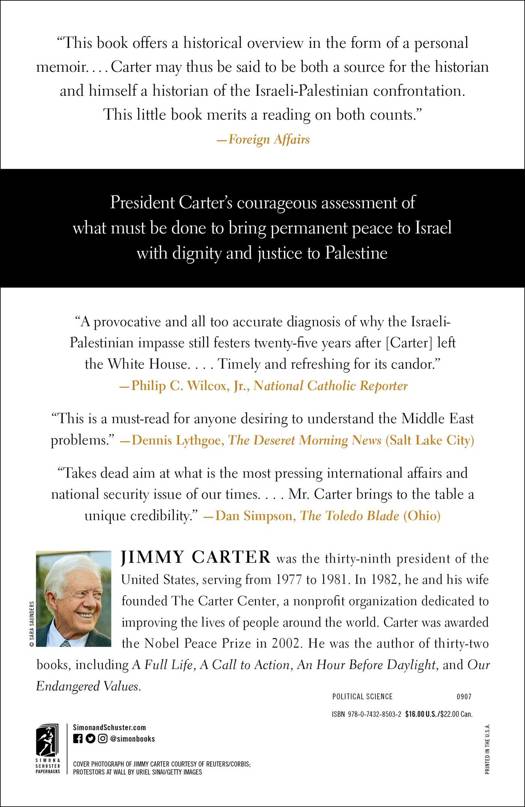In this book, President Carter shares his intimate knowledge of the history of the Middle East and his personal experiences with the principal actors, and he addresses sensitive political issues many American officials avoid. Pulling no punches, Carter prescribes steps that must be taken for the two states to share the Holy Land without a system of apartheid or the constant fear of terrorism.