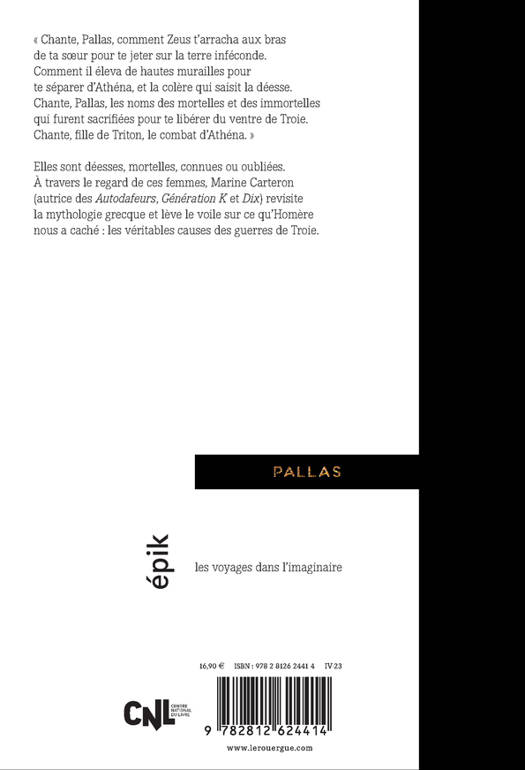 « Chante, Pallas, comment Zeus t'arracha aux bras de ta soeur pour te jeter sur la terre inféconde. Comment il éleva de hautes murailles pour te séparer d'Athéna, et la colère qui saisit la déesse. Chante, Pallas, les noms des mortelles et des immortelles qui furent sacrifiées pour te libérer du ventre de Troie. Chante, fille de Triton, la vengeance d'Athéna. » Marine Carteron, autrice des Autodafeurs, Génération K et Dix, revisite la mythologie grecque au travers du regard des déesses et des mortelles. Une trilogie qui lève le voile sur ce qu'Homère nous a caché : les véritables causes des guerres de Troie.