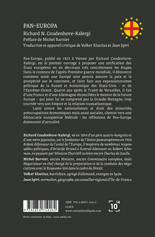 Pan-Europa, publié en 1923 à Vienne par Richard Coudenhove-Kalergi, est le premier ouvrage à proposer une unification des États européens en en décrivant très concrètement les étapes. Dans le contexte de l’après-Première guerre mondiale, il démontre comment seule une Europe unie pourra assurer la paix et la prospérité sur le continent, et faire face aux expansionnismes politique de la Russie et économique des États-Unis – et de l’Extrême-Orient. Quatre ans après le Traité de Versailles, il fait d’une France et d’une Allemagne réconciliées le moteur de la future Europe – qui pour lui ne comprend pas la Grande-Bretagne, trop tournée vers son Empire et la relation transatlantique. Lutte contre les nationalismes et droit des minorités, préoccupations économiques mais aussi sociales, chemin vers une démocratie européenne fédérale : les réflexions de Pan-Europa demeurent d’actualité.