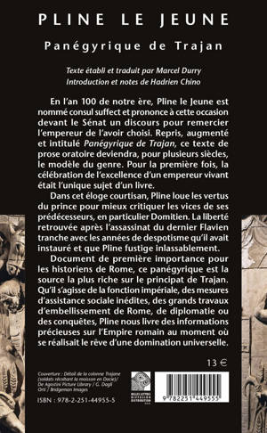 En l'an 100 de notre ere, Pline le Jeune est nomme consul suffect et prononce a cette occasion devant le Senat un discours pour remercier l'empereur de l'avoir choisi. Repris, augmente et intitule Panegyrique de Trajan, ce texte de prose oratoire deviendra, pour plusieurs siecles, le modele du genre. Pour la premiere fois, la celebration de l'excellence d'un empereur vivant etait l'unique sujet d'un livre. Dans cet eloge courtisan, Pline loue les vertus du prince pour mieux critiquer les vices de ses predecesseurs, en particulier Domitien. La liberte retrouvee apres l'assassinat du dernier Flavien tranche avec les annees de despotisme qu'il avait instaure et que Pline fustige inlassablement. Document de premiere importance pour les historiens de Rome, ce panegyrique est la source la plus riche sur le principat de Trajan. Qu'il s'agisse de la fonction imperiale, des mesures d'assistance sociale inedites, des grands travaux d'embellissement de Rome, de diplomatie ou des conquetes, Pline nous livre des informations pecieuses sur l'Empire romain au moment ou se realisait le reve d'une domination universelle.