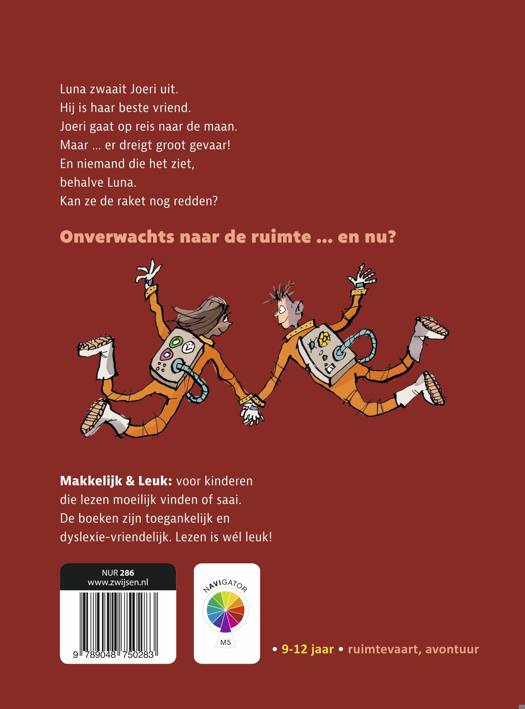 Als een verdachte man de raket naar de maan binnen glipt, bedenkt Luna zich geen minuut. Haar vriend Joeri is in gevaar en zij is de enige die dat weet. Kan Luna Joeri en de raket redden? Spannend verhaal op AVI M5 voor kinderen van 9 tot 12 jaar. De serie ‘Makkelijk & Leuk’ is speciaal gemaakt voor kinderen die lezen moeilijk vinden of saai. Zo krijgen zij weer plezier in lezen.