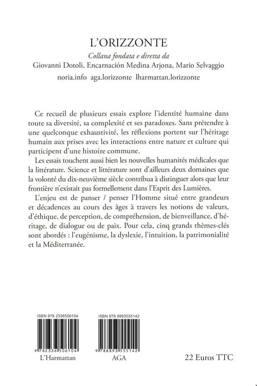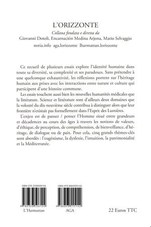 Ce recueil de plusieurs essais explore l’identité humaine dans toute sa diversité, sa complexité et ses paradoxes. Sans prétendre à une quelconque exhaustivité, les réflexions portent sur l’héritage humain aux prises avec les interactions entre nature et culture qui participent d’une histoire commune. Les essais touchent aussi bien les nouvelles humanités médicales que la littérature. Science et littérature sont d’ailleurs deux domaines que la volonté du dix-neuvième siècle contribua à distinguer alors que leur frontière n’existait pas formellement dans l’Esprit des Lumières. L’enjeu est de panser / penser l’Homme situé entre grandeurs et décadences au cours des âges à travers les notions de valeurs, d’éthique, de perception, de compréhension, de bienveillance, d’héritage, de dialogue ou de paix. Pour cela, cinq grands thèmes-clés sont abordés : l’eugénisme, la dyslexie, l’intuition, la patrimonialité et la Méditerranée.