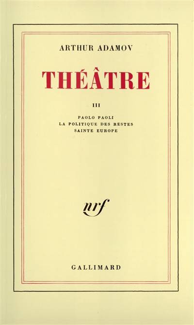 De Paolo Paoli à Sainte Europe, en passant par La Politique des restes, Arthur Adamov poursuit l'évolution amorcée dès Le Ping-Pong, en esquissant une large tragi-comédie de la vie sociale. Ces trois pièces, pourtant fort dissemblables, ont un thème commun : celui du trafic, un trafic qui n'est pas seulement l'échange des biens, mais encore l'échange des sentiments, même les plus intimes. Ainsi la réalité est abordée sous ses deux faces : celle des grands conflits historiques comme la guerre de 14-18, la politique raciste en Afrique du Sud, le partage des influences et des intérêts dans le tiers monde ... et celle aussi des solitudes et des névroses individuelles qui, comme l'ont bien montré Frantz Fanon et Danilo Dolci, tout en étant le produit d'une évolution historique, empêchent les hommes de faire leur propre histoire. Mais, si la succession de ces trois pièces apparaît logique, chacune d'elles possède un ton qui lui est propre. Alors que dans Paolo Paoli Arthur Adamov s'attache à décrire minutieusement la situation d'un petit monde clos - qui renvoie d'ailleurs à toute l'histoire de l'époque -, dans Sainte Europe il enjambe allégrement plusieurs siècles et fait interférer la vie publique avec l'existence la plus secrète, celle de nos songes, pour créer une satire à la mesure de notre temps.