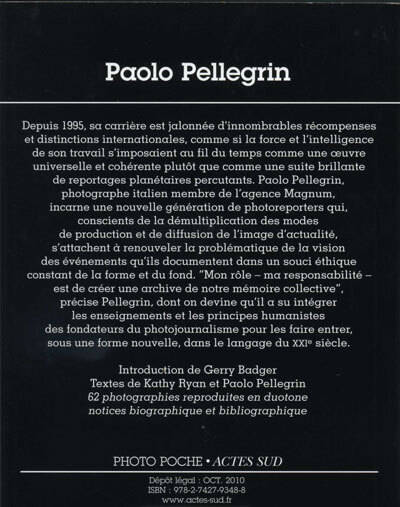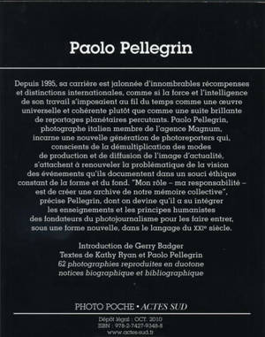 Depuis 1995, sa carrière est jalonnée d'innombrables récompenses et distinctions internationales, comme si la force et l'intelligence de son travail s'imposaient au fil du temps comme une oeuvre universelle et cohérente plutôt que comme une suite brillante de reportages planétaires percutants. Paolo Pellegrin, photographe italien membre de l'agence Magnum, incarne une nouvelle génération de photoreporters qui, conscients de la démultiplication des modes de production et de diffusion de l'image d'actualité, s'attachent à renouveler la problématique de la vision des événements qu'ils documentent dans un souci éthique constant de la forme et du fond. "Mon rôle - ma responsabilité - est de créer une archive de notre mémoire collective", précise Pellegrin, dont on devine qu'il a su intégrer les enseignements et les principes humanistes des fondateurs du photojournalisme pour les faire entrer, sous une forme nouvelle, dans le langage du XXIe siècle.