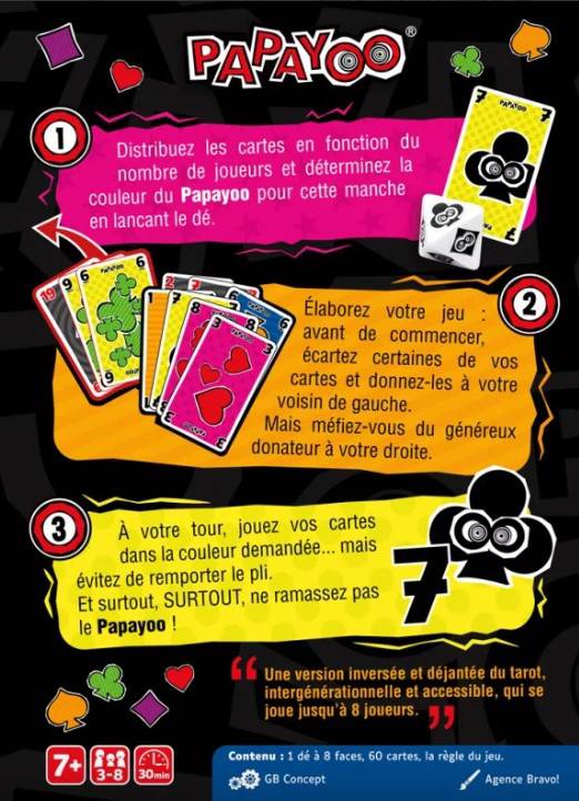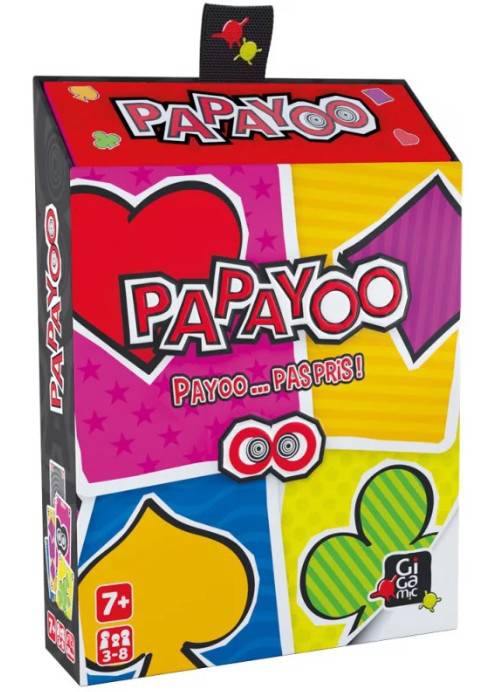 Un jeu qui a de drôles d'atouts ! Dans ce jeu de plis aux cinq couleurs, il ne faut surtout pas marquer de points ! Pour se faire, évitez de remporter des plis mais surtout de ramasser les Payoos et le maudit Papayoo, ce 7 dont la couleur est déterminée au hasard à chaque début de manche. Papayoo : une alternative vivifiante à tous les jeux de cartes traditionnels.