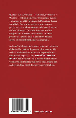 Quelque 500 000 Belges - Flamands, Bruxellois et Wallons - ont un membre de leur famille qui fut « du mauvais côté » pendant la Deuxième Guerre mondiale. Des grands-pères, grands-mères, pères, mères, oncles ou tantes. À la base, il y avait 400 000 dossiers d'accusés. Environ 100 000 citoyens ont aussi été condamnés à diverses peines : de l'exécution à la privation de leurs droits en passant par l'emprisonnement. Aujourd'hui, les petits-enfants et autres membres de la famille partent de plus en plus souvent à la recherche des vraies circonstances pour donner une place à ce passé. Dans Papy était-il un nazi ?, des historiens de la guerre et archivistes vous donnent les clés pour partir vous-même à la recherche de ce passé de guerre souvent tabou.